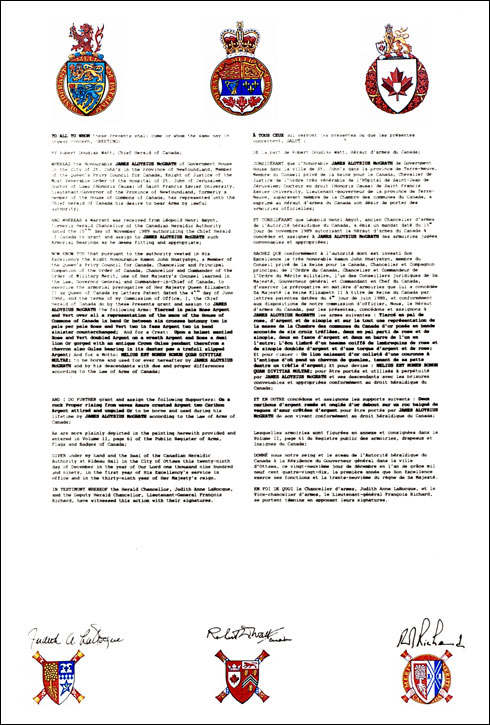 Additional InformationCreator(s)Original concept of Robert D. Watt, Chief Herald of Canada, assisted by the heralds of the Canadian Heraldic Authority. PainterCathy Bursey-Sabourin CalligrapherNancy Ellis Recipient TypeIndividual Special DesignationLieutenant Governor |