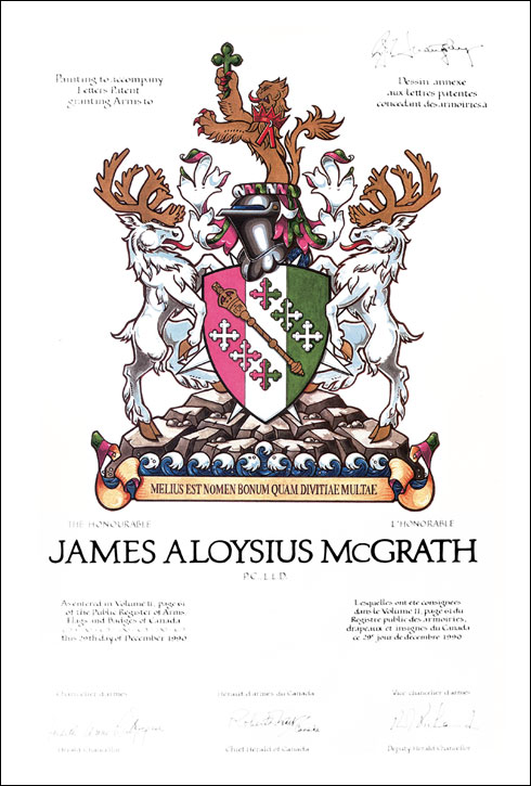 Arms of James Aloysius McGrathBlazonTierced in pale Rose Argent and Vert over all a representation of the mace of the House of Commons of Canada in bend Or between six crosses botonny two in pale per pale Rose and Vert two in fess Argent two in bend sinister counterchanged; |