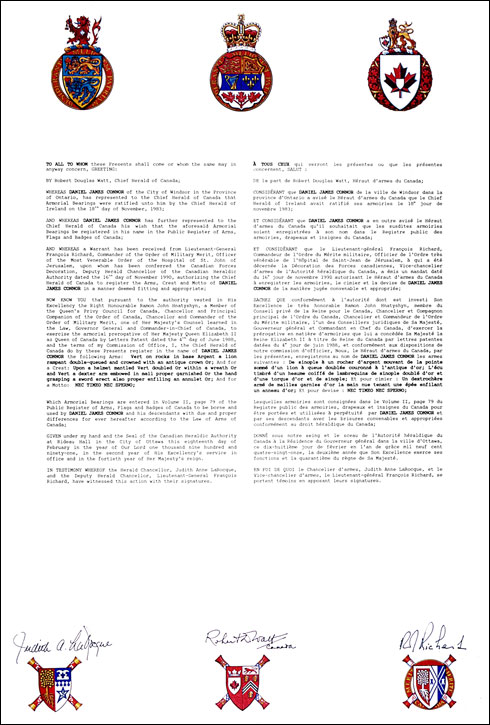 The contents of this Register are intended for research purposes only. The heraldic emblems found in the Register may not be reproduced in any form or in any media without the written consent of the Canadian Heraldic Authority and/or the recipient.