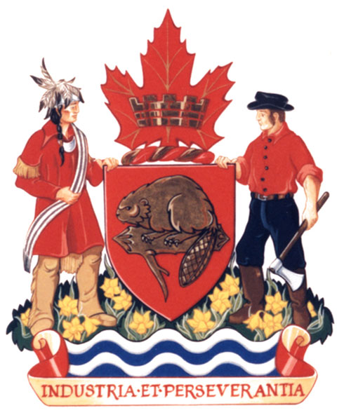 SupportersBlazonUpon a grassy mound strewn with daffodil flowers proper rising above barry wavy Azure and Argent to the dexter a Mohawk in traditional dress of the period 1784 bearing in the dexter hand and across the sinister shoulder the Gus-wen-tah wampum belt and to the sinister a pioneer logger in dress of the period 1830 bearing in the sinister hand a single bladed axe all proper; |