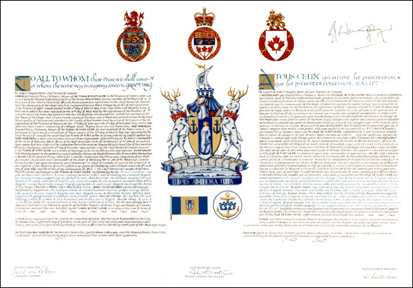 Additional InformationCreator(s)Original concept of Robert D. Watt, Chief Herald of Canada, assisted by the heralds of the Canadian Heraldic Authority. PainterAnatol Kozlowski CalligrapherJohn Whitehead Recipient TypeCivil Institution