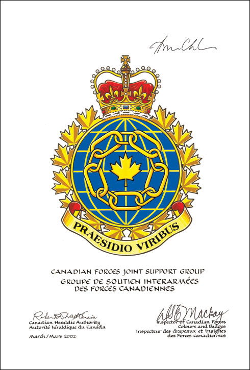 Additional InformationCreator(s)Original concept of Robert D. Watt, Chief Herald of Canada, and Cathy Sabourin, Fraser Herald, assisted by the Heralds of the Canadian Heraldic Authority PainterRobert Grey CalligrapherDoris Wionzek Recipient TypeMilitary Institution Other InformationThe recipient's emblems were originally recorded in the name of Canadian Forces Joint Support Group in the Public Register of Arms, Flags and Badges of Canada, Volume IV, page 210, 1 March 2002. |