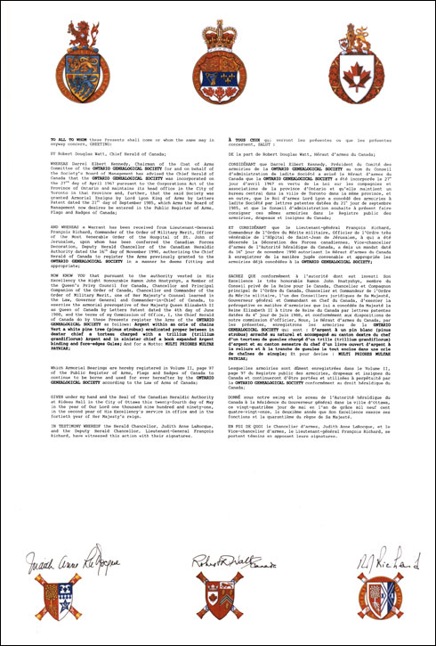 Arms of the Ontario Genealogical SocietyBlazonArgent within an orle of chains Vert a white pine tree (Pinus strobus) eradicated proper between in dexter chief a torteau charged with a trillium (Trillium grandiflorum) Argent and in sinister chief a book expanded Argent binding and fore-edges Gules; |
