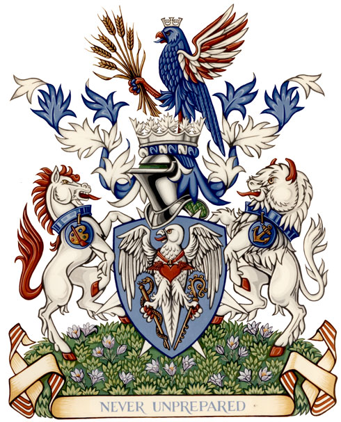 SupportersBlazonOn a grassy mound scattered with Prairie crocus flowers proper dexter a horse Argent crined, langued, queued and unguled Gules gorged with a collar Azure pendant therefrom a hurt charged with an artist's palette Or and paintbrush Gules sinister a buffalo Argent langued, horned and unguled Gules gorged with a collar Azure pendant therefrom a hurt charged with an anchor Or; |