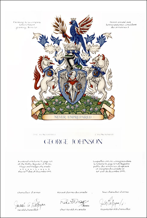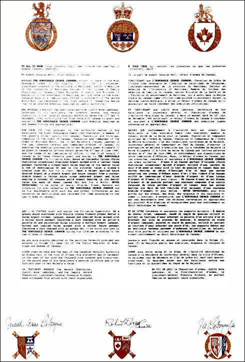 Additional InformationCreator(s)Original concept of Robert D. Watt, Chief Herald of Canada assisted by the heralds of the Canadian Heraldic Authority. PainterJoan Bouwmeester CalligrapherJoan Bouwmeester Recipient TypeIndividual Special DesignationLieutenant Governor |