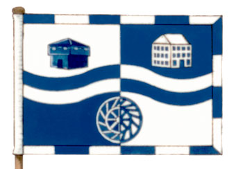 Arms of The Corporation of the Village of Merrickville-WolfordBlazonQuarterly Argent and Azure overall a fess wavy quarterly Azure and Argent in the first quarter a representation of the Blockhouse at Merrickville Azure in the second quarter a Georgian mill building Argent and in base a mill race wheel counterchanged; SymbolismThe wavy bands represent the waterway of the Rideau Canal upon which the village was founded. The blockhouse is significant for its utility as a defence structure for the canal’s three locks. Both the Georgian mill and the mill race wheel are symbols of the extensive milling activity of the village, which became an important industrial centre as a result of the canal construction. |