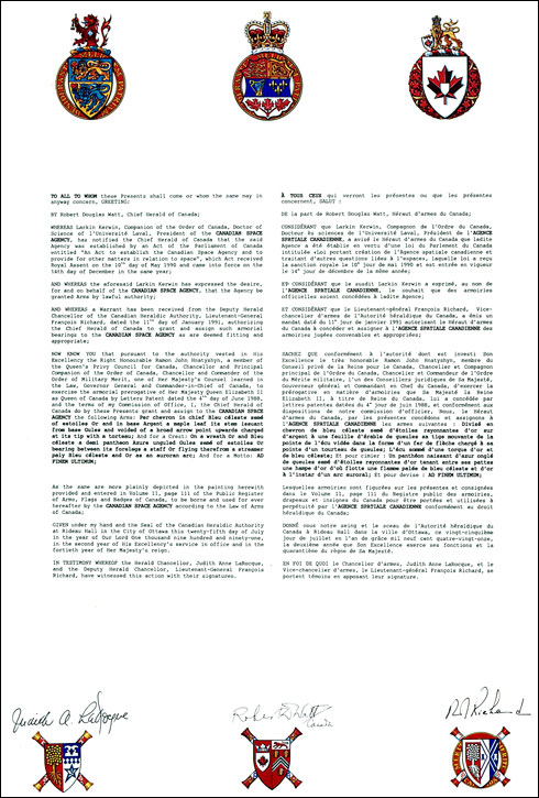 Arms of the Canadian Space AgencyBlazonPer chevron in chief Bleu céleste semé of estoiles Or and in base Argent a maple leaf its stem issuant from base Gules and voided of a broad arrow point upwards charged at its tip with a torteau; |