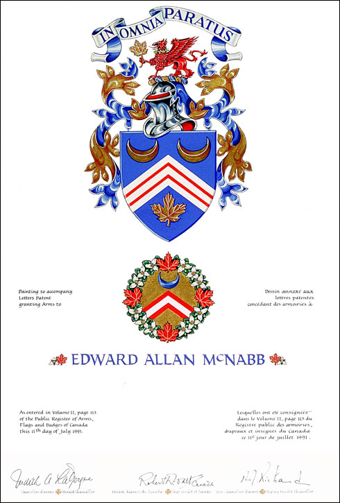 Arms of Edward Allan McNabbBlazonAzure on a chevron Argent between two crescents in chief and a maple leaf in base Or two chevronels Gules; |