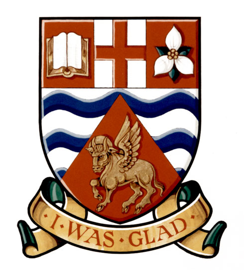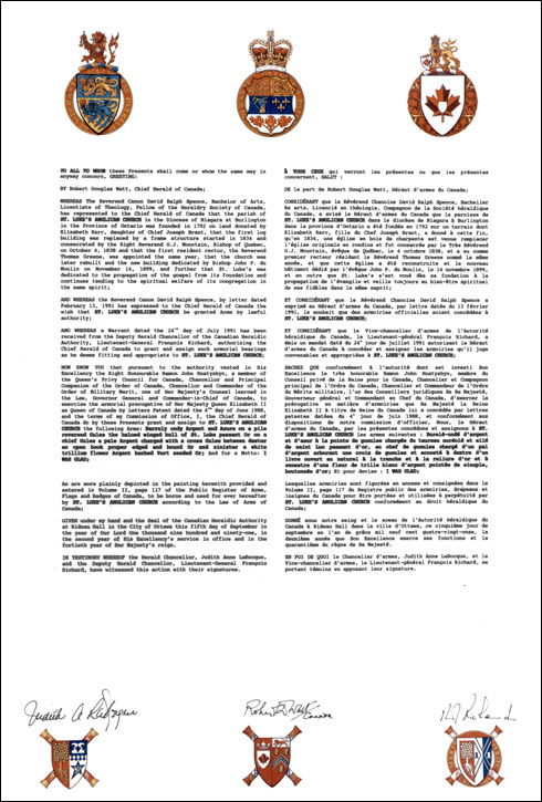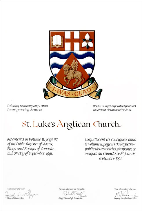 Arms of St. Luke's Anglican ChurchBlazonBarruly undy Argent and Azure on a pile reversed Gules the haloed winged bull of St. Luke passant Or on a chief Gules a pale Argent charged with a cross Gules between dexter an open book proper edged and bound Or and sinister a white trillium flower Argent barbed Vert seeded Or; |