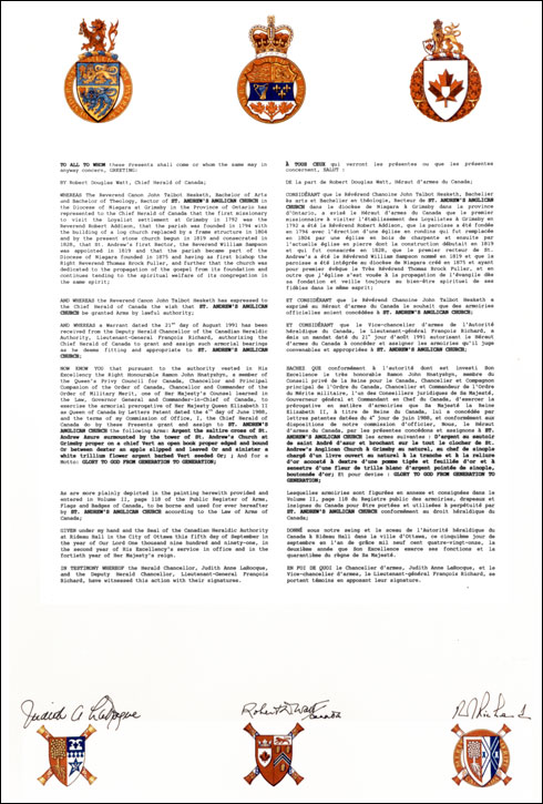 Arms of St. Andrew's Anglican ChurchBlazonArgent the saltire cross of St. Andrew Azure surmounted by the tower of St. Andrew's Amglican Church at Grimsby proper on a chief Vert an open book proper edged and bound Or between dexter an apple slipped and leaved Or and sinister a white trillium flower argent barbed Vert seeded Or; |