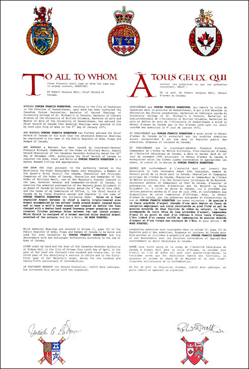 The contents of this Register are intended for research purposes only. The heraldic emblems found in the Register may not be reproduced in any form or in any media without the written consent of the Canadian Heraldic Authority and/or the recipient.