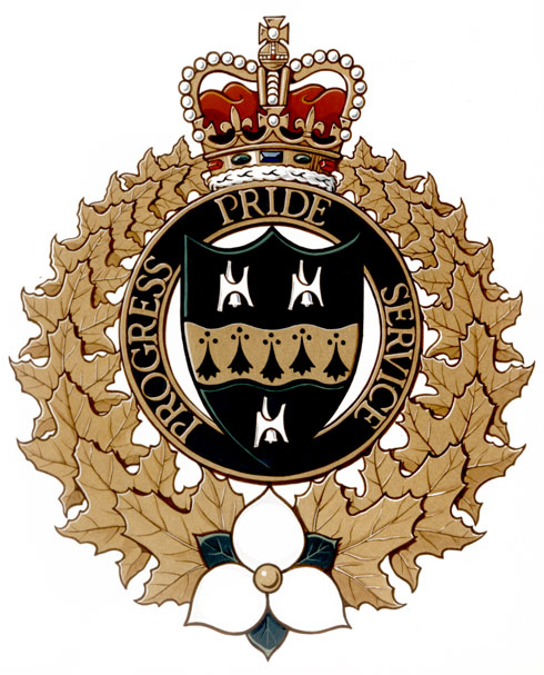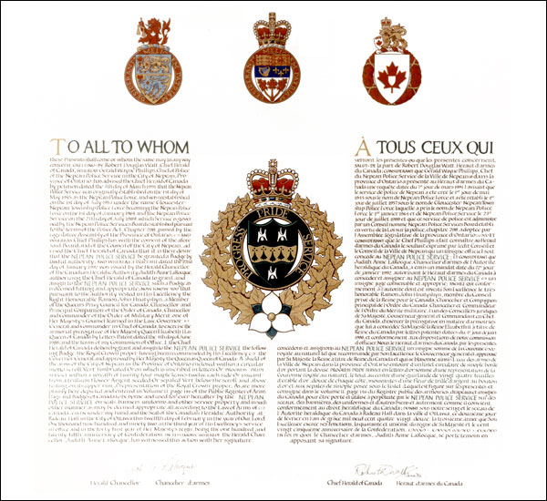 Badge of the Nepean Police ServiceBlazonA shield of the arms of the City of Nepean in the Province of Ontario enclosed within a circular motto scroll Vert fimbriated Or on which is inscribed in letters Or PROGRESS • PRIDE • SERVICE within a wreath of twenty-four maple leaves twelve each side Or issuant from a trillium flower Argent seeded Or sepaled Vert below the scroll and above resting on its upper rim a representation of the Royal Crown proper; |