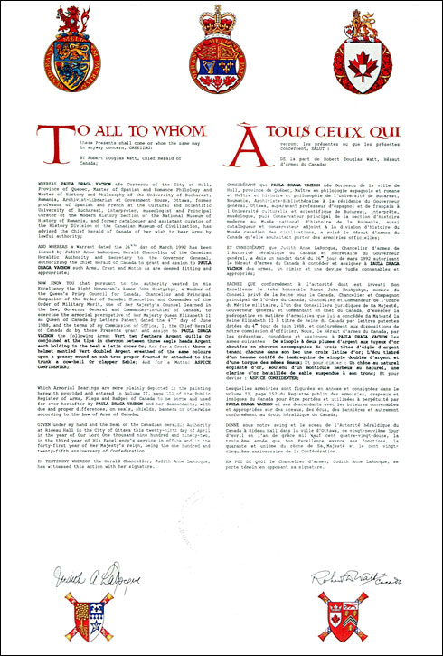 Additional InformationCreator(s)Original concept of Auguste Vachon, Saint-Laurent Herald, assisted by the heralds of the Canadian Heraldic Authority. PainterHans Birk CalligrapherJohn Whitehead Recipient TypeIndividual |