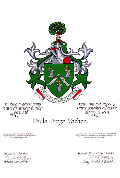 Arms of Paula Draga VachonBlazonVert two feathers Argent quills Or conjoined at the tips in chevron between three eagle heads Argent each holding in the beak a Latin cross Or; SymbolismThe feathers represent the two intellectual pursuits of Mrs. Gornescu-Vachon, namely philology and history. The three eagle heads holding a Latin cross in the beak allude to the coat of arms of her place of birth, the principality of Wallachia in Romania. The cross also symbolizes her unshakeable faith. |