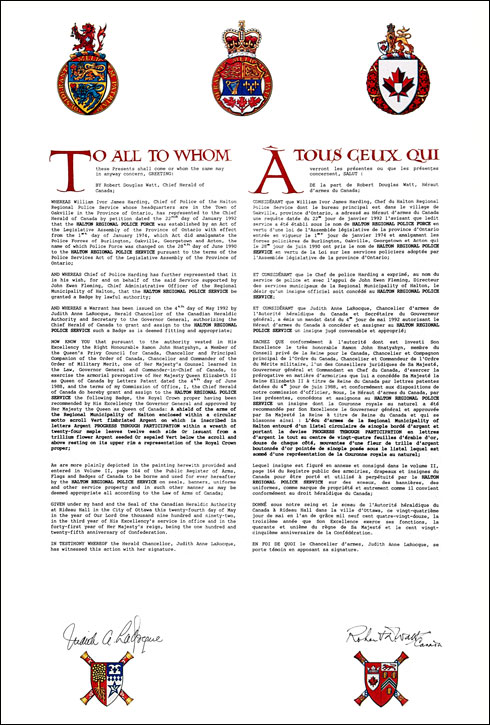 Additional InformationCreator(s)Original concept of Robert D. Watt, Chief Herald of Canada, assisted by the heralds of the Canadian Heraldic Authority. PainterJoan Ouellette CalligrapherNancy Ellis Recipient TypeCivil Institution