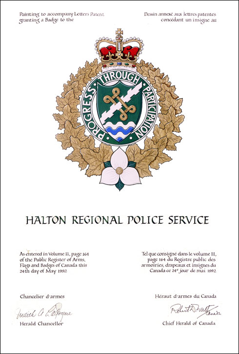 Badge of the Halton Regional Police ServiceBlazonA shield of the arms of the Regional Municipality of Halton enclosed within a circular motto scroll Vert fimbriated Argent on which is inscribed in letters Argent PROGRESS THROUGH PARTICIPATION within a wreath of twenty-four maple leaves twelve each side Or issuant from a trillium flower Argent seeded Or sepaled Vert below the scroll and above resting on its upper rim a representation of the Royal Crown proper; |