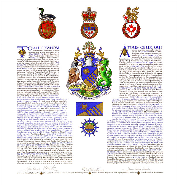 Additional InformationCreator(s)Original concept of Robert D. Watt, Chief Herald of Canada, assisted by the Heralds of the Canadian Heraldic Authority PainterDebra MacGarvie CalligrapherJudith Bainbridge Recipient TypeCivil Institution