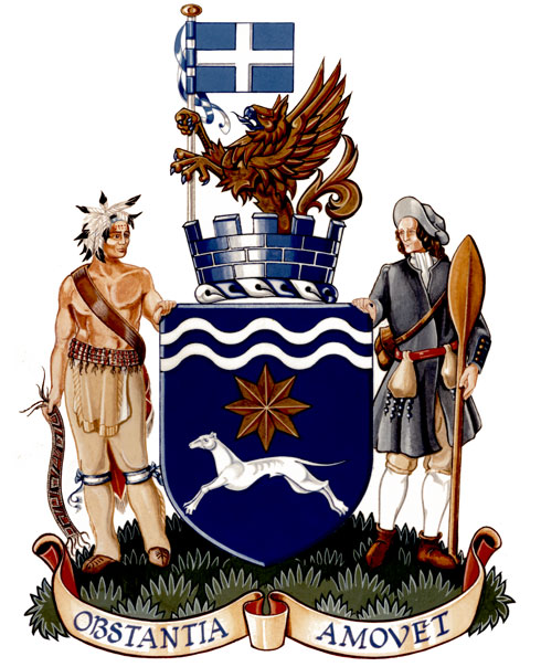 SupportersBlazonDexter an Iroquois holding in his dexter hand a wampum belt, sinister a coureur de bois holding in his sinister hand a paddle, both standing on a grassy mound proper; |