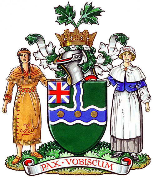 SupportersBlazonOn a grassy mound Vert, dexter a First Nations woman of the region, sinister a Loyalist woman, both tempore 1784 proper; SymbolismThe supporters allude to the early history of the area. The First Nations’ woman indicates not only the Mohawk Loyalist settlers, but also the Mississauga people who lived in the area for centuries before. The woman on the viewer’s right represents the Loyalists of European background who settled in Gananoque following the American Revolution. |