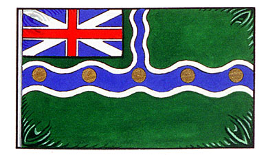 Arms of the Town of GananoqueBlazonVert a fess wavy bezanté conjoined with a pallet wavy in chief, both Azure fimbriated Argent, a canton of the Union flag of 1707; SymbolismThe colour green indicates the verdant lands around the town. The large horizontal stripe refers to the St. Lawrence River, and the smaller vertical stripe refers to the Gananoque Creek. The gold discs indicate that the Thousand Islands are nearby. The canton of the Royal Union flag of 1707 indicates that the town was settled by the Loyalists, who identified strongly with this flag. |