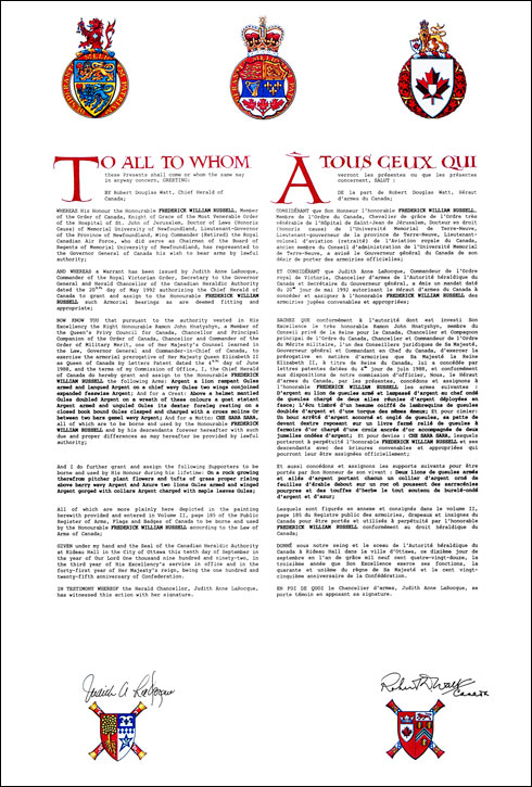 The contents of this Register are intended for research purposes only. The heraldic emblems found in the Register may not be reproduced in any form or in any media without the written consent of the Canadian Heraldic Authority and/or the recipient.