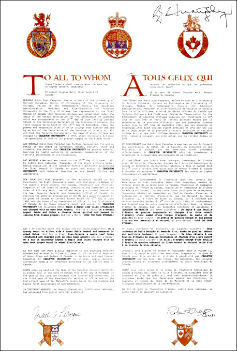 Additional InformationCreator(s)Original concept of Robert D. Watt, Chief Herald of Canada, assisted by the heralds of the Canadian Heraldic Authority. PainterJoan Bouwmeester CalligrapherJoan Bouwmeester Recipient TypeCivil Institution