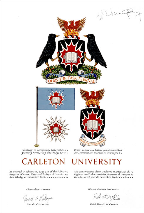 Arms of Carleton UniversityBlazonSable a maple leaf Gules irradiated and charged with an open book Argent; |