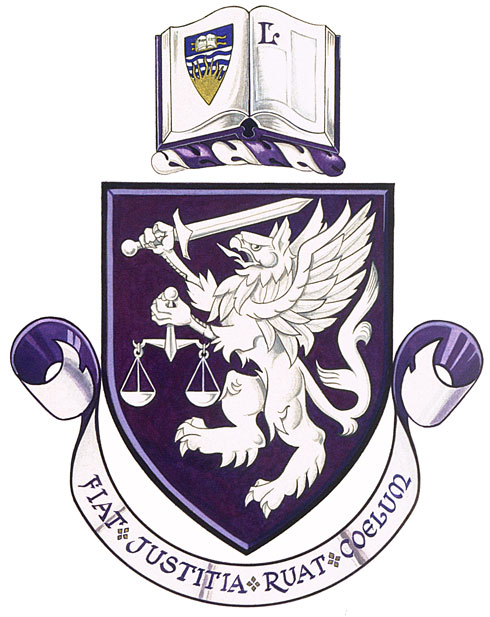 Arms of the Faculty of Law of the University of British ColumbiaBlazonPurpure a griffin rampant holding with the dexter forepaw a sword and with the sinister forepaw scales of justice all Argent; |