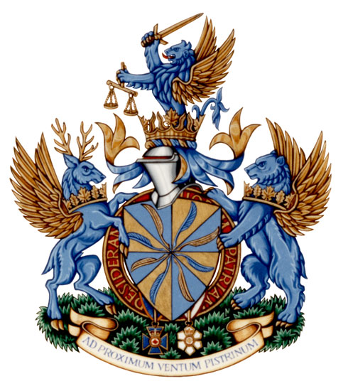 CrestBlazonOut of a Canadian astral crown Or a demi lion Bleu Celeste winged and holding in the dexter forepaw a sword and in the sinister forepaw scales of justice all Or; |