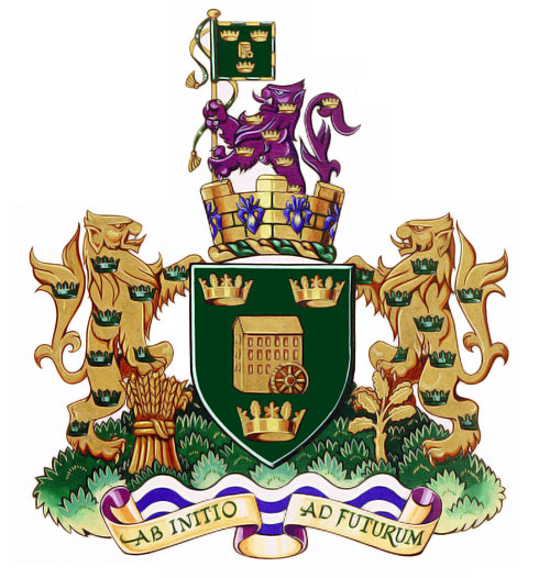 Arms of the Corporation of the Town of AncasterBlazonVert a representation of a Georgian water powered grist mill between three Loyalist Civil Coronets Or; |