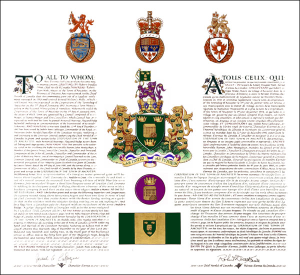 Additional InformationCreator(s)Original concept of Robert D. Watt, Chief Herald of Canada, assisted by the heralds of the Canadian Heraldic Authority. PainterLinda Nicholson CalligrapherJudith Bainbridge Recipient TypeCivil Institution