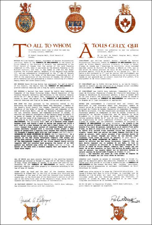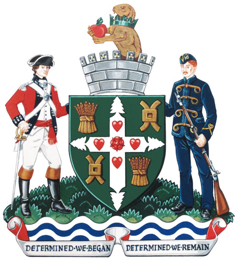 SupportersBlazonOn a grassy mound rising above barry wavy Argent and Azure dexter an officer of the New Jersey Volunteers tempore 1784 proper his dexter hand resting on the pommel of his sword sinister an officer of the Ameliasburgh Company of the Prince Edward County militia tempore 1867 his sinister hand grasping the barrel of an 1853 pattern Lee Enfield long rifle all Proper; |
