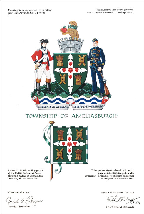 Arms of the Township of AmeliasburghBlazonVert on a Mission cross Argent between first and fourth a garb of barley and second and third a mill rind Or a rose between on each arm a heart Gules; |