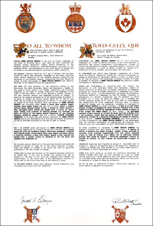 Additional InformationCreator(s)Original concept of Robert D. Watt, Chief Herald of Canada, assisted by the heralds of the Canadian Heraldic Authority. PainterCathy Bursey-Sabourin CalligrapherNancy Ellis Recipient TypeIndividual |