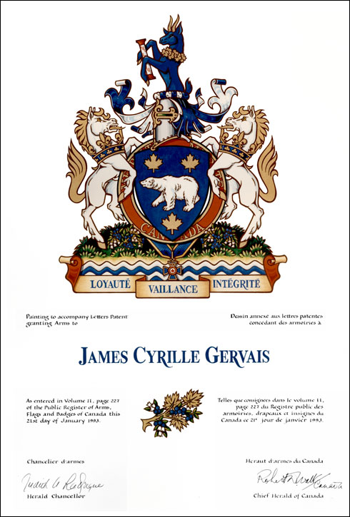 Arms of James Cyrille GervaisBlazonAzure a polar bear passant Argent between three maple leaves Or; |