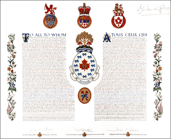 Additional InformationCreator(s)Original concept of Robert D. Watt, Chief Herald of Canada, assisted by the heralds of the Canadian Heraldic Authority. PainterJoan Bouwmeester CalligrapherJoan Bouwmeester Recipient TypeCivil Institution