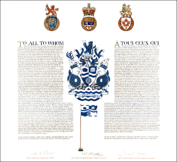 Additional InformationCreator(s)Original concept of Robert D. Watt, Chief Herald of Canada, assisted by the heralds of the Canadian Heraldic Authority. PainterJoan Ouellette CalligrapherNancy Ellis Recipient TypeCivil Institution