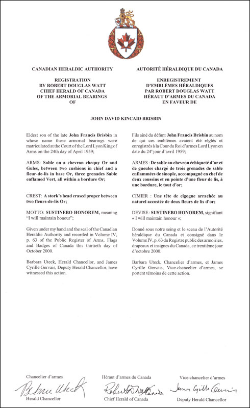 Arms of John David Kincaid BrisbinBlazonSable on a chevron chequy Or and Gules, between two cushions in chief and a fleur de-lis in base Or, three grenades Sable enflamed Vert, all within a bordure Or; SymbolismNot applicable |