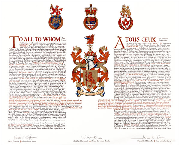 Additional InformationCreator(s)Original concept of Gordon Macpherson, assisted by the heralds of the Canadian Heraldic Authority. PainterGordon Macpherson CalligrapherMaurice Hogue Recipient TypeCivil Institution