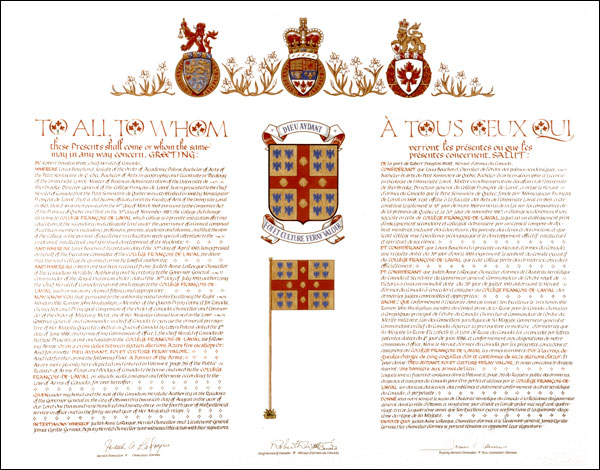 Additional InformationCreator(s)Original concept of the Collège François-de-Laval, assisted by the heralds of the Canadian Heraldic Authority. PainterJoan Ouellette CalligrapherJohn Whitehead Recipient TypeCivil Institution