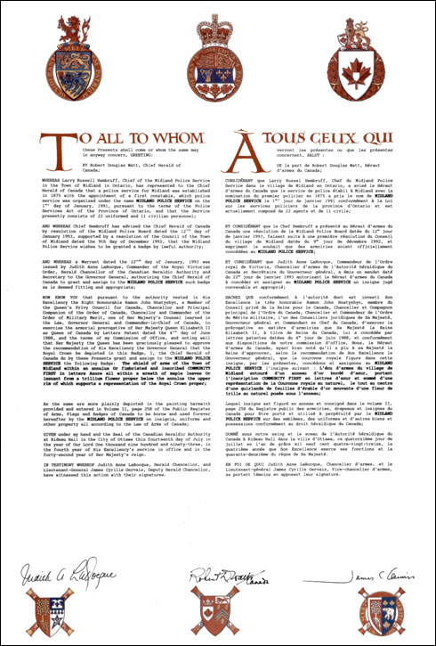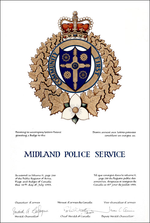 Badge of the Midland Police ServiceBlazonThe shield of Arms of the Town of Midland within an annulet Or edged on either side Azure inscribed COMMUNITY FIRST in letters Azure all within a wreath of maple leaves Or held at the base by a trillium flower Argent seeded Or sepaled Vert the whole ensigned by a representation of the Royal Crown; |