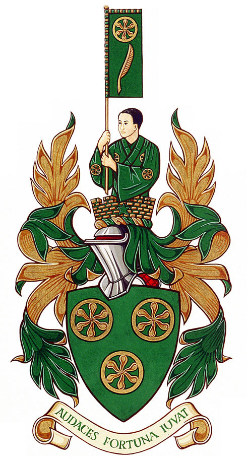 CrestBlazonOut of a mural coronet Or masoned Vert charged with a mullet Vert a demi man proper habited in a Japanese Kimono Vert charged on either breast and each sleeve of a Tsubouchi mon Or holding with both hands a staff proper flying therefrom a Japanese banner Vert in Chief a like mon in base a quill Or; |