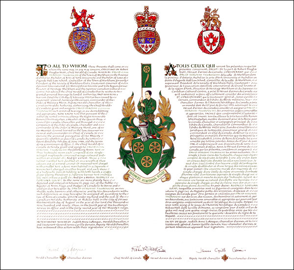 Additional InformationCreator(s)Original concept of Robert D. Watt, Chief Herald of Canada, assisted by the heralds of the Canadian Heraldic Authority. PainterJoan Bouwmeester CalligrapherJoan Bouwmeester Recipient TypeIndividual |