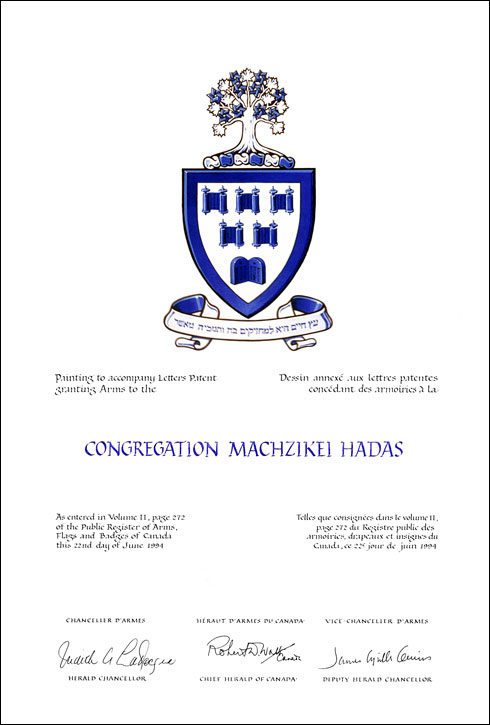 Arms of the Congregation Machzikei HadasBlazonArgent five open Torah scrolls three and two and in base the Tablets of the Law all within a bordure Azure; |