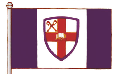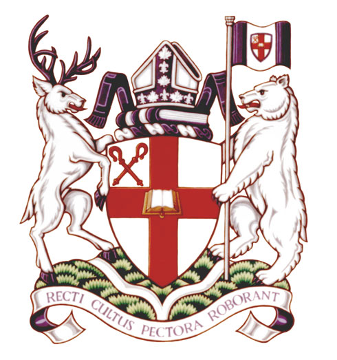 CrestBlazonA closed book laid flat bound Purpure edged Argent thereon a mitre Argent orphreys Purpure charged with fleurs-de-lys and maple leaves alternately Argent the infulae Purpure; |
