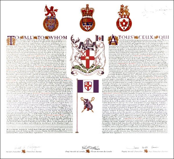 Additional InformationCreator(s)Original concept of Bishop’s University, assisted by the heralds of the Canadian Heraldic Authority. PainterJoan Bouwmeester CalligrapherJoan Bouwmeester Recipient TypeCivil Institution