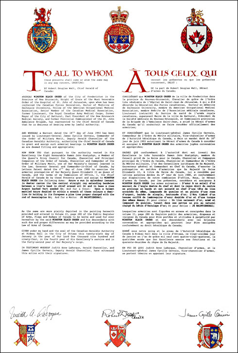 Additional InformationCreator(s)Original concept of John Williamson, assisted by the heralds of the Canadian Heraldic Authority. PainterDebra Parker CalligrapherJudith Bainbridge Recipient TypeIndividual |