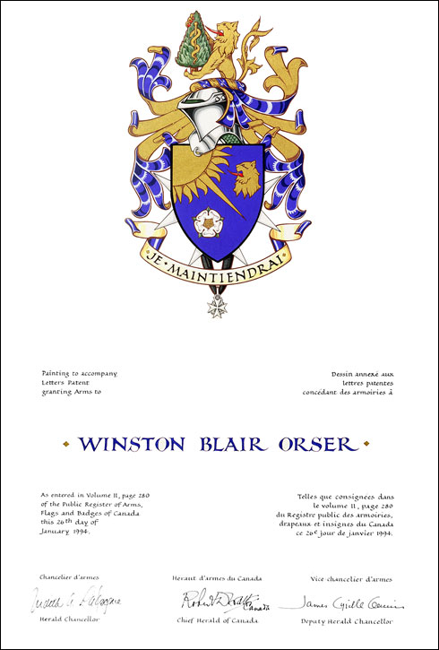 Arms of Winston Blair OrserBlazonAzure a sun in splendour issuant in dexter canton its central straight ray extending bendwise between a lion's head in chief erased all Or and in base a rose Argent barbed Vert seeded Or; |