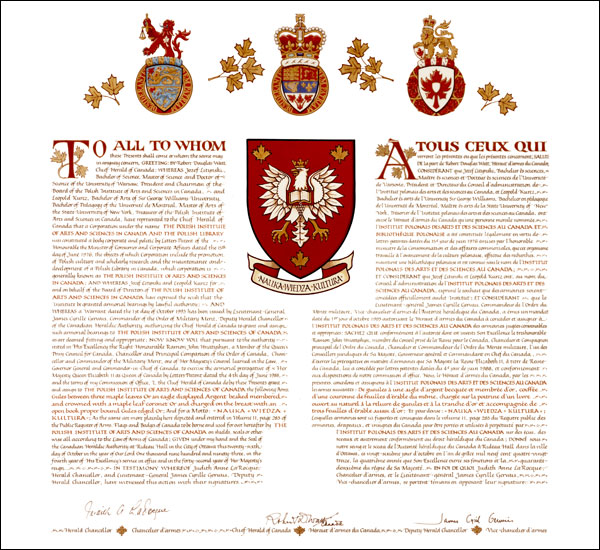 Arms of The Polish Institute of Arts and Sciences in Canada and the Polish LibraryBlazonGules between three maple leaves Or an eagle displayed Argent beaked membered and crowned with a maple leaf coronet Or and charged on the breast with an open book proper bound Gules edged Or; |