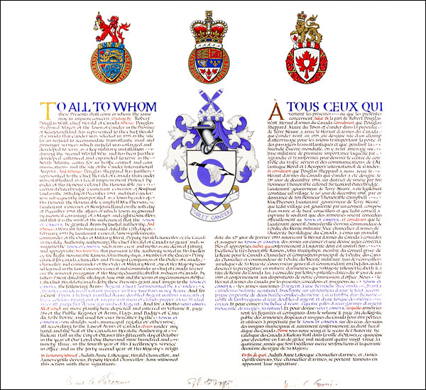 Additional InformationCreator(s)Original concept of Charles Maier, Athabaska Herald, assisted by the heralds of the Canadian Heraldic Authority. PainterRobert Grey CalligrapherNancy Ellis Recipient TypeCivil Institution